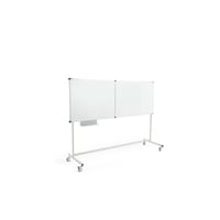 Tredelad, stor whiteboard med fem skrivytor. Kan stängas för att dölja texten. På golvstativ med hjul. Levereras med pennhylla.