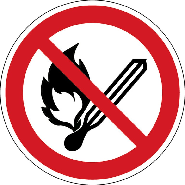 Förbudsskylt som visar vart förbud för rökning och öppen eld finns. Denna säkerhetsskylt uppfyller europeisk standard.