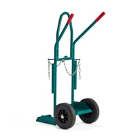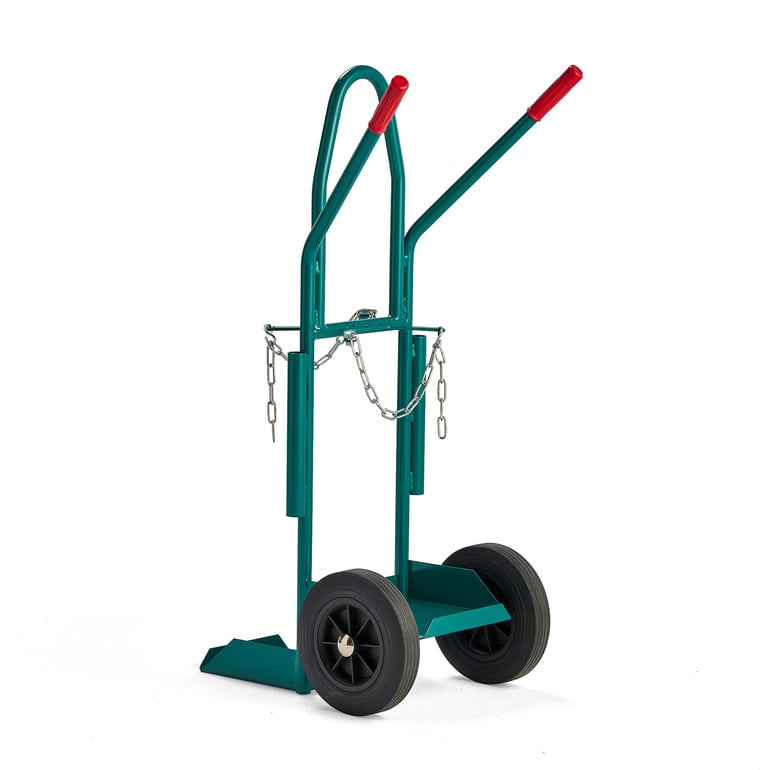 Smidig gastubskärra som kan transportera två gastuber samtidigt. Med säkerhetskedjor som håller tuberna på plats, stadiga handtag och lättrullande hjul.